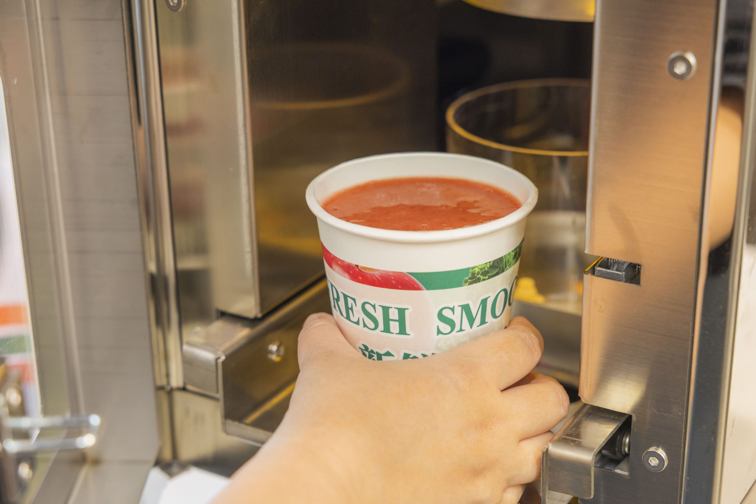 7-ELEVEN首度導入「智能果昔機」,為超商通路獨家機型,機身大小設計符合超商坪效需求,透過專利破壁技術與智慧標準化、自動化精準出杯,只需約90秒就能喝到一杯好喝又風味一致果昔。「智能果昔機」目前限定於欣旺、福正、民欣三家門市24小時販售,消費者到冷凍冰箱挑選果昔商品後至櫃檯結帳,每杯封膜上皆有獨一無二專屬Qrcode,於機台前方掃碼後就可撕膜置入果昔機製作。