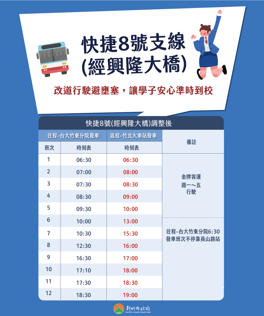 為避開上午尖峰時段竹北興隆大橋壅塞情形,新竹縣政府交通處宣布十二日起,快捷八號支線,從竹北往竹東上午六時卅分發車班次將改道行駛,不停靠竹東「員山路口」站,預計節省十五至廿分鐘行車時間,讓學生更加安心準時到校上課。