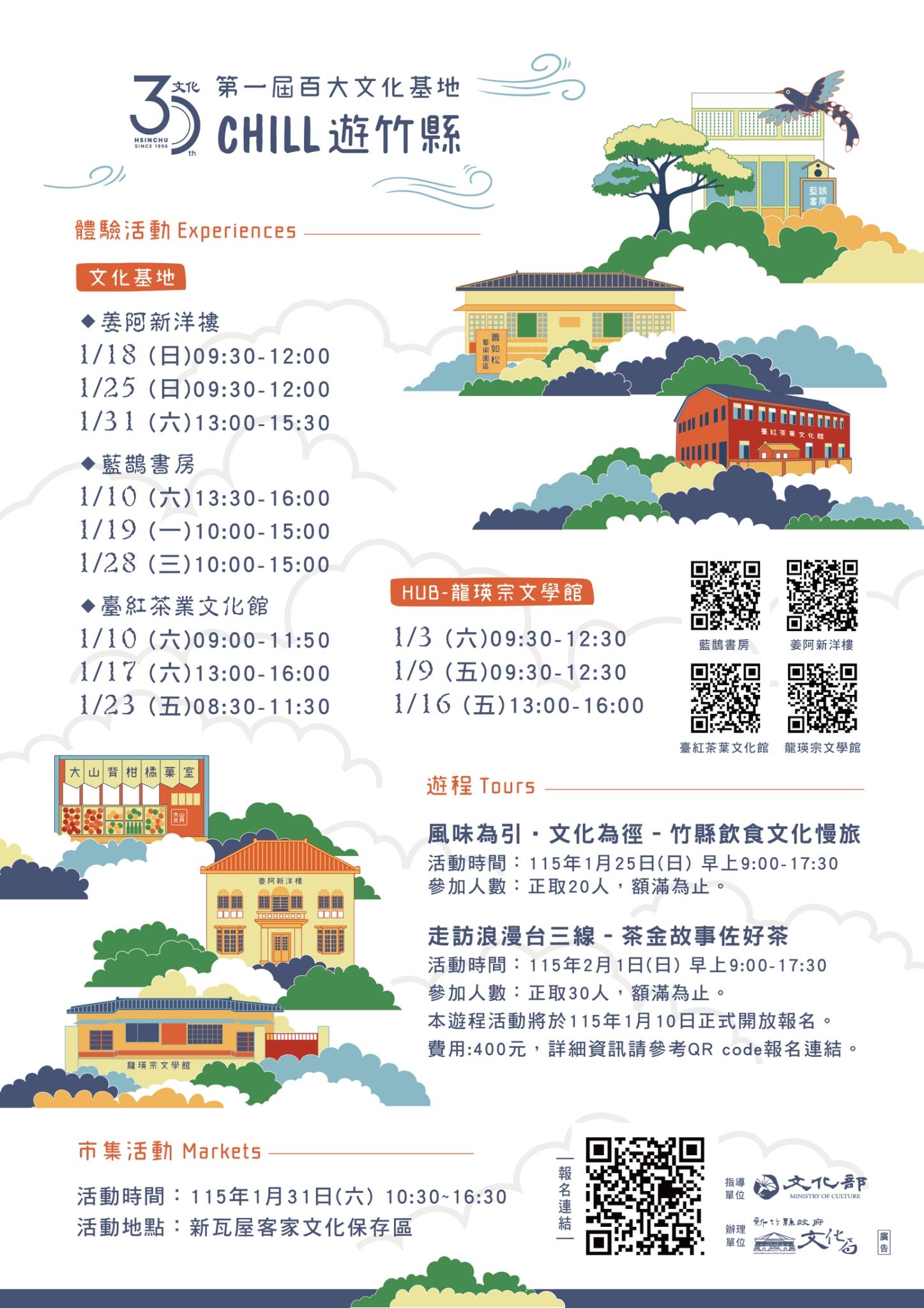 新竹縣第一屆百大文化基地活動「Chill遊竹縣」,由龍瑛宗文學館擔任HUB(文化基地樞紐平臺),向外串聯五大基地,包含橫山鄉大山北月、北埔鄉藍鵲書房、姜阿新洋樓、關西鎮臺紅茶業文化館及竹東鎮蕭如松藝術園區,共規劃十八場體驗活動,二條展現竹縣風貌的遊程,十日起開放報名,活動內容包括手作體驗、走讀活動,還能參加集章兌換限量文化基地特色產品。
