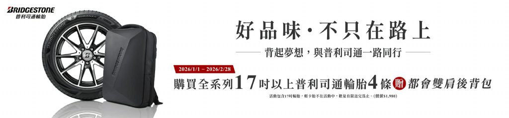 普利司通促銷活動,即日起至2月底期間內凡購買4條17吋(含)以上輪胎(輕卡胎除外),便可獲得都會雙肩後背包。包含TURANZA:著重舒適與靜謐表現,適合長時間行車。ALENZA:專為家庭SUV車款打造,在濕滑路況下仍能維持穩定操控。POTENZA:兼顧乾濕地抓地力與操控精準度,提升駕駛樂趣。