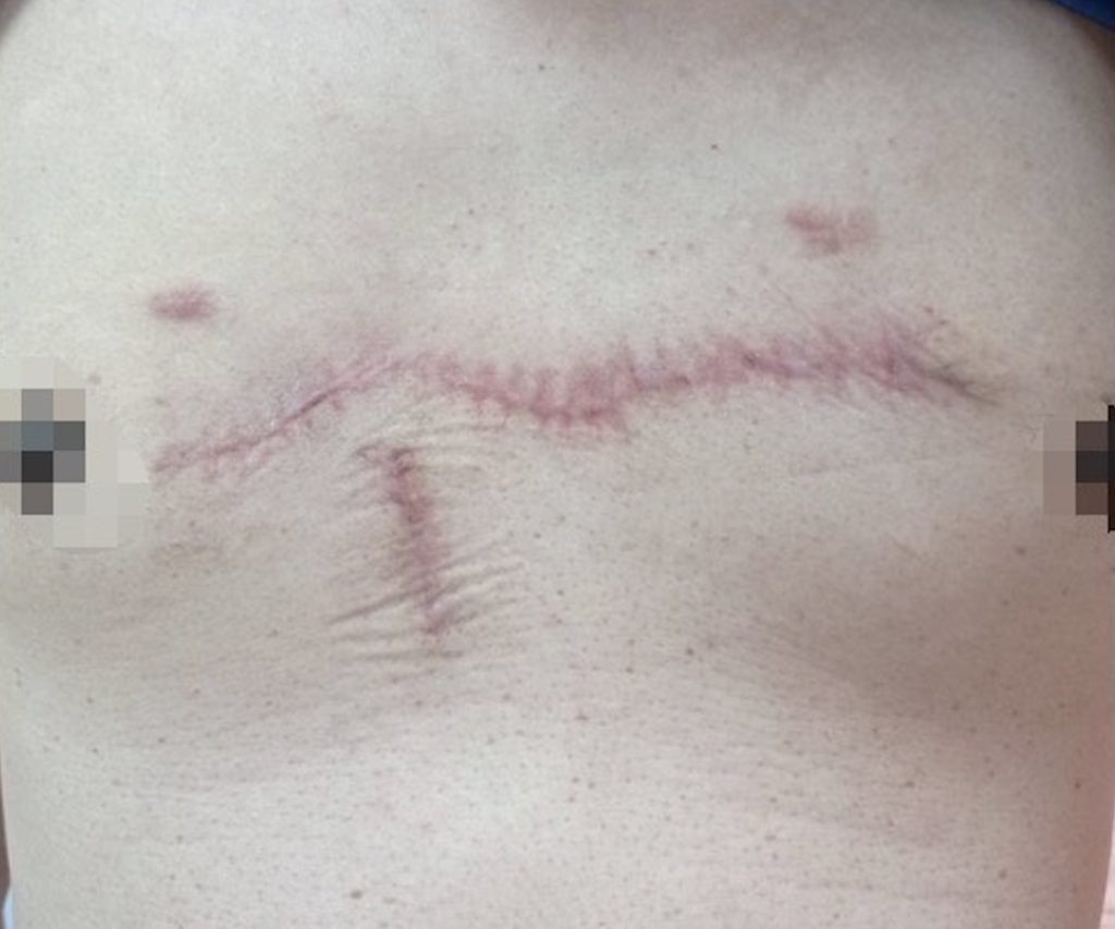 一名20多歲男性,數月前胸部長了一顆小小青春痘,他不小心擠破,原以為只是輕微外傷,未料傷口遲遲無法癒合,持續增生長成長10餘公分、寬4、5公分的疤痕,且有發癢、疼痛或灼熱感,醫師診斷為「蟹足腫」,經手術切除後再用生物膜覆蓋縫入傷口,情況明顯改善。