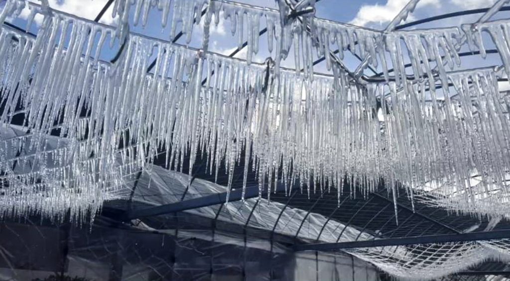 武陵農場表示,武陵農場昨日清晨出現零下一點四度低溫,加上輻射冷卻效應,藤花園為防止澆灌系統結凍,啟動灑水防護措施,因遇到低溫水柱凝結,出現美麗的冰晶和冰柱,結冰呈現水晶宮般的補夢網,地面草皮也出現冰花,宛如冰宮世界與天然巨型水晶燈。