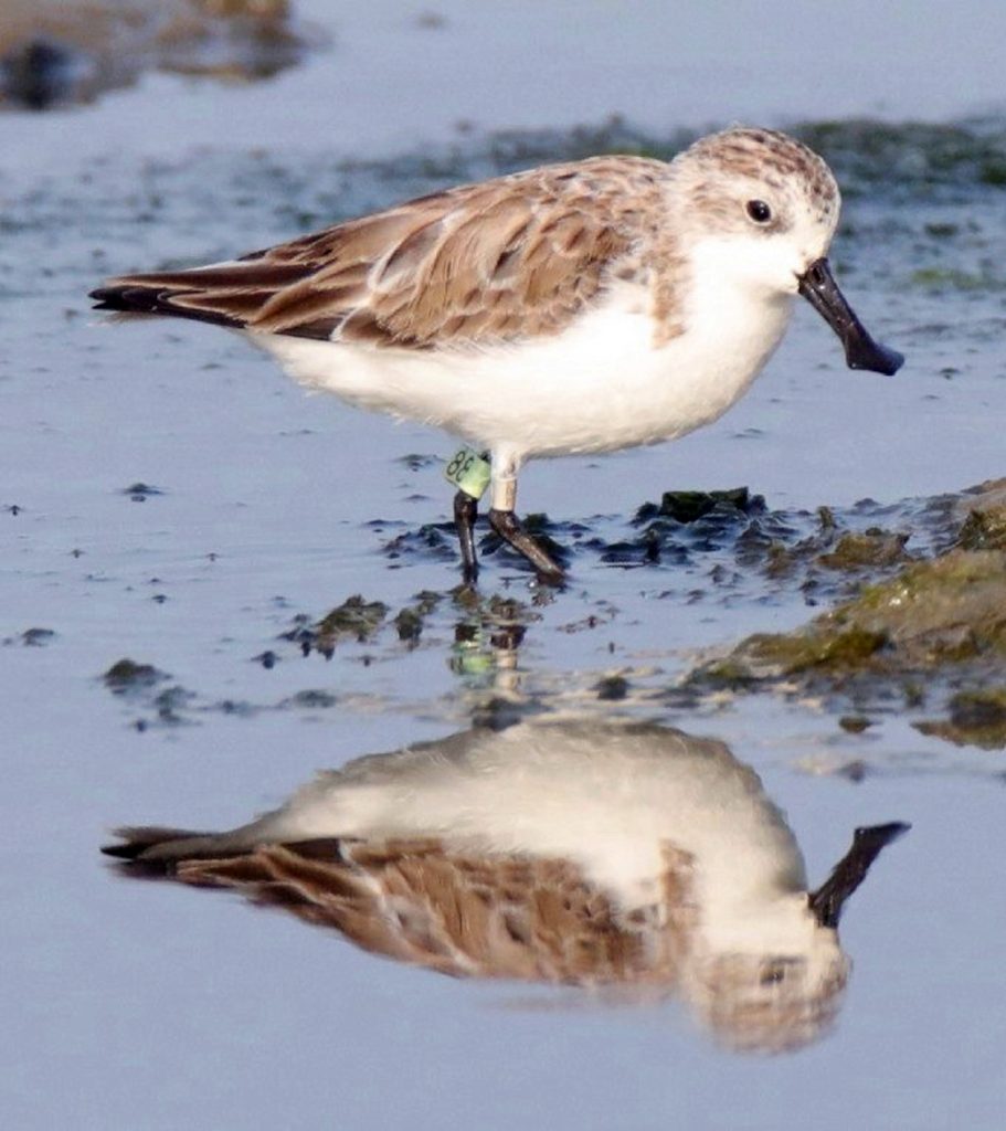 台南市野鳥學會理事長潘致遠近日前往將軍濕地尋找遺鷗,意外發現外型極為特殊的琵嘴鷸,並確認左腳配戴淺綠色足旗「88」號。據了解,二0二0年曾在將軍濕地紀錄繫上「88」足旗的琵嘴鷸,確認是相同個體。
