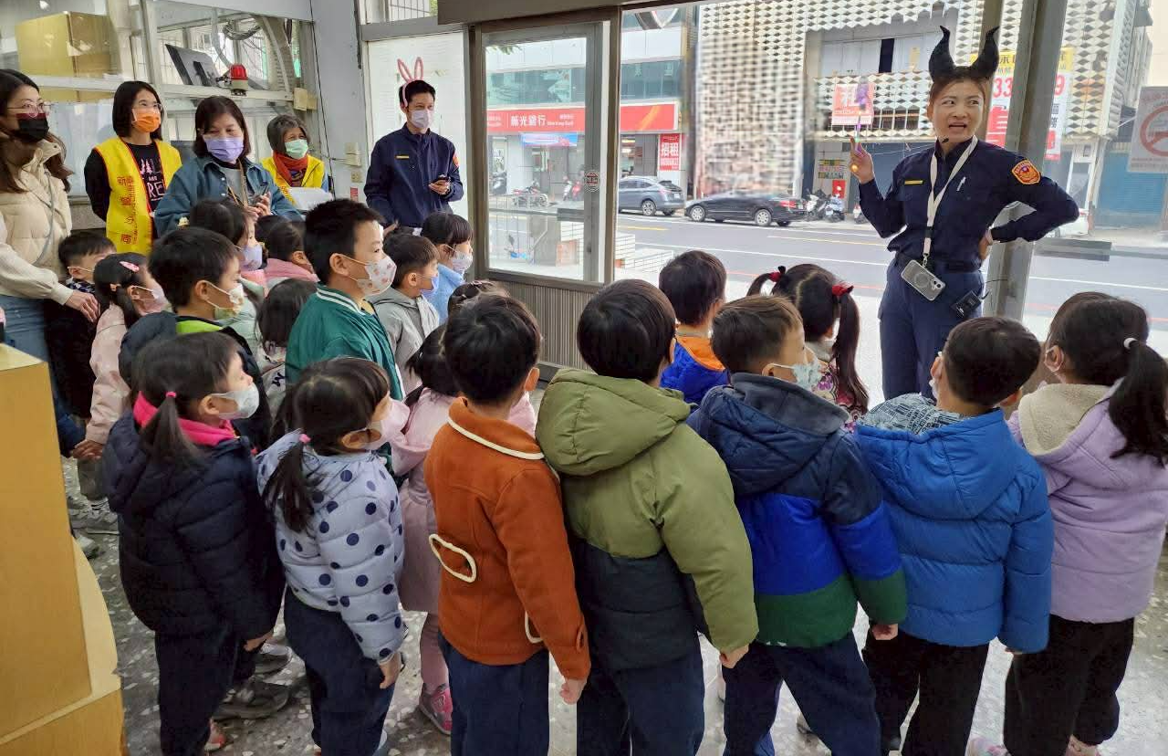 新營立上幼兒園昨至新營警分局參訪,負責接待的員警規劃先帶領幼生通過時光隧道的地下停車場通道進入分局駐地,幼生走出通道後即看到化身為魔女與兔兔及熊熊警察造型的員警,為幼兒介紹巡邏車與一般民車的差異,及認識在路上聽到警鳴聲代表員警在執行緊急任務應優先禮讓等觀念。