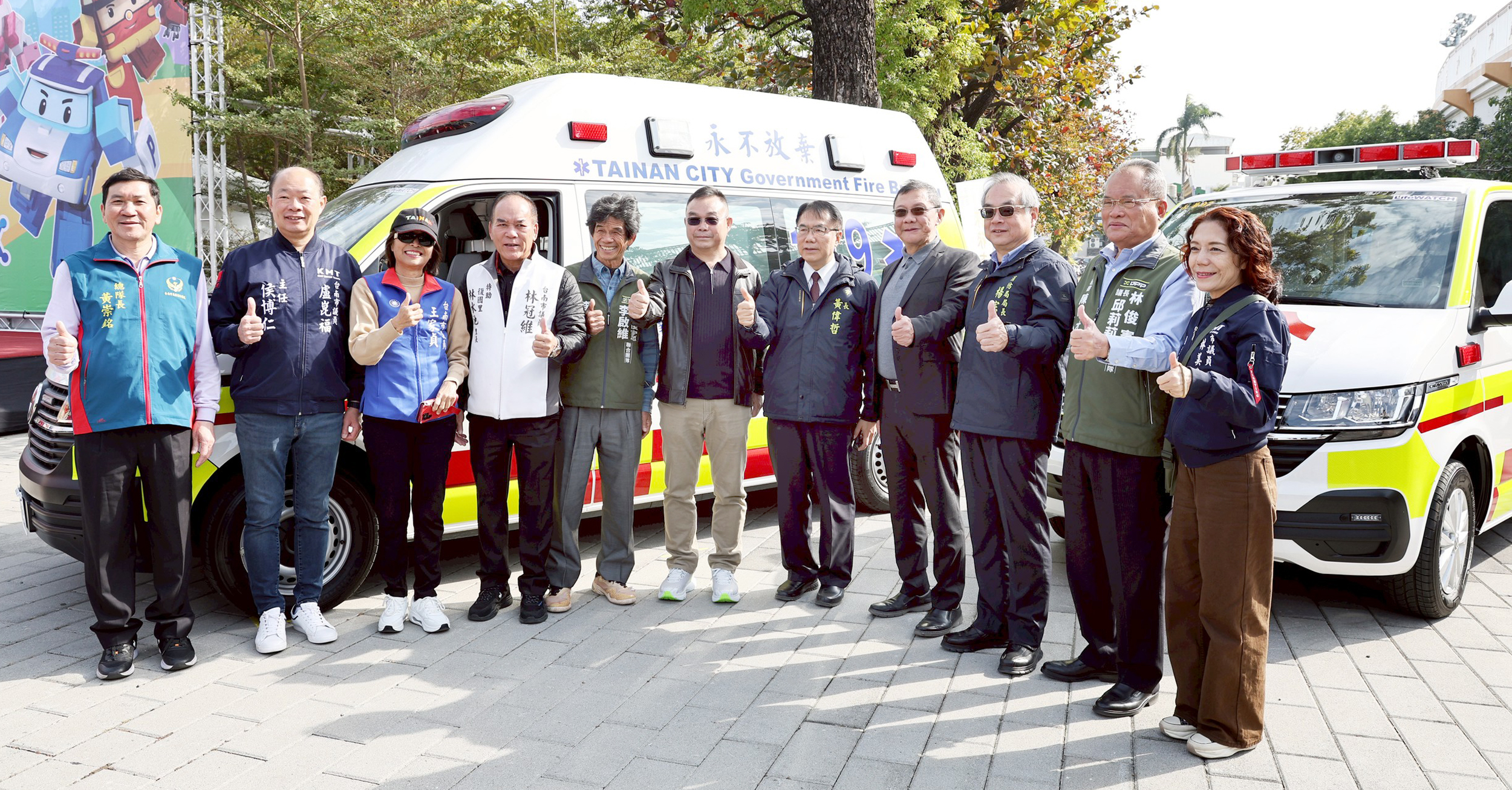 寯陽實業及成綸企業捐贈救護車、工豐企業捐贈救災設備,奇美實業攜手消防局簽署MOU深耕企業防災。農曆春節將至,黃偉哲頒發春節慰問品提前感謝消防人員堅守工作崗位守護市民安全。