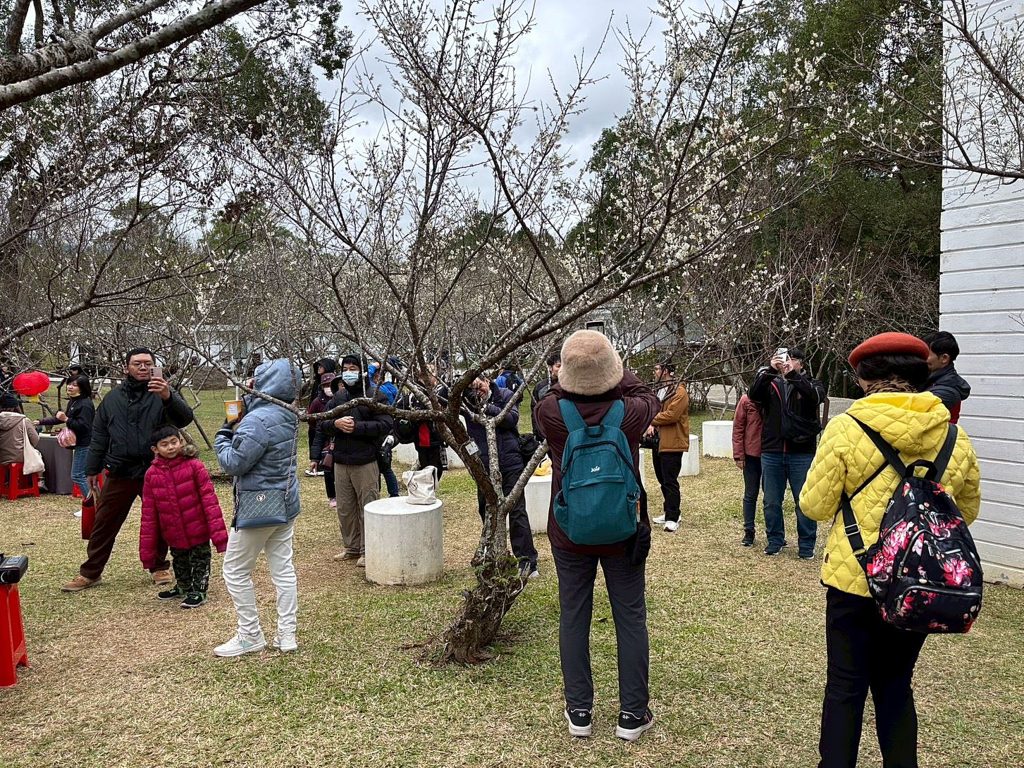 桃園市角板山行館園區內近三百棵梅花樹陸續綻放。風管處十一日表示,目前花況約五成,估中旬進入盛開期,市府將每週更新資訊,民眾可隨時查詢掌握花況。