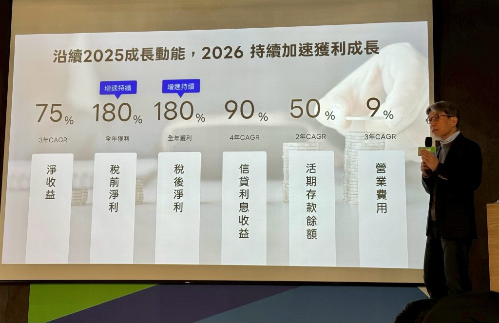 台灣純網銀邁向獲利新紀元!LINE Bank(連線商業銀行)今(12)日正式宣布根據2025年12月自結財報結果,達成單月稅前淨利超過1,100萬,寫下開業4.7年來的重大里程碑,並成為台灣第一家實現獲利的純網銀。LINE Bank憑藉開業後快速累積百萬客戶為基礎,短時間內積極拓展平台生態圈,在貸款與存款規模快速擴張下,展現強大成長動能達成獲利,累積超過220萬用戶的堅實基礎及28項創新金融服務。LINE Bank強調2025年淨收益表現展現強勁、高速的成長態勢,目標衝刺2026年單季、半年、全年均獲利。