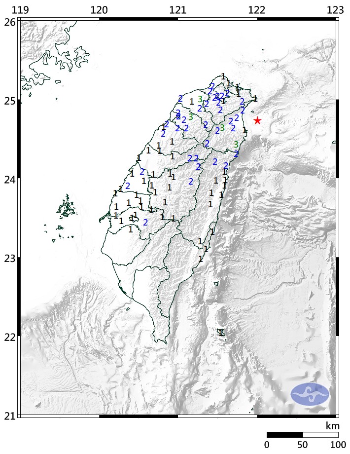 中央氣象署指出,這起地震震央位於宜蘭縣政府東方二十四點九公里處,宜蘭、桃園、新竹最大震度都為三級,二級震度區包括新北市、花蓮縣、台北市、台中市、南投縣、新竹市、苗栗縣、彰化縣,一級震度區域有基隆市、台東縣、雲林縣、嘉義市及台南市。