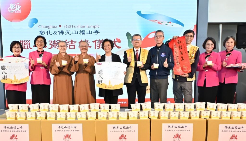 為恭迎農曆十二月八日釋迦牟尼佛成道日「法寶節」到來,佛光山彰化福山寺住持永嚴法師及國際佛光會中華總會副總會長周學文等人,十三日到彰化縣政府拜訪縣長王惠美並贈送「臘八粥」予縣府同仁,王縣長亦回贈結緣禮品,感謝佛光山對社會公益的付出,期盼新的一年吉祥如意、平安順遂。