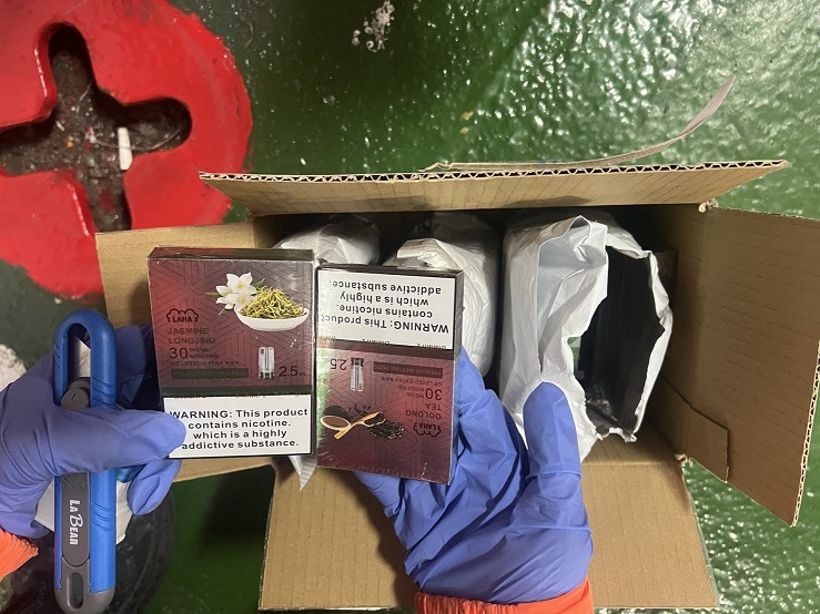 海巡人員當天晚間約九時運用手持及背散射X光檢查儀,結合搜救犬嗅聞進行包裹拆檢,查獲大陸製造、未經衛福部核准電子煙主機一支、煙油十二盒。
