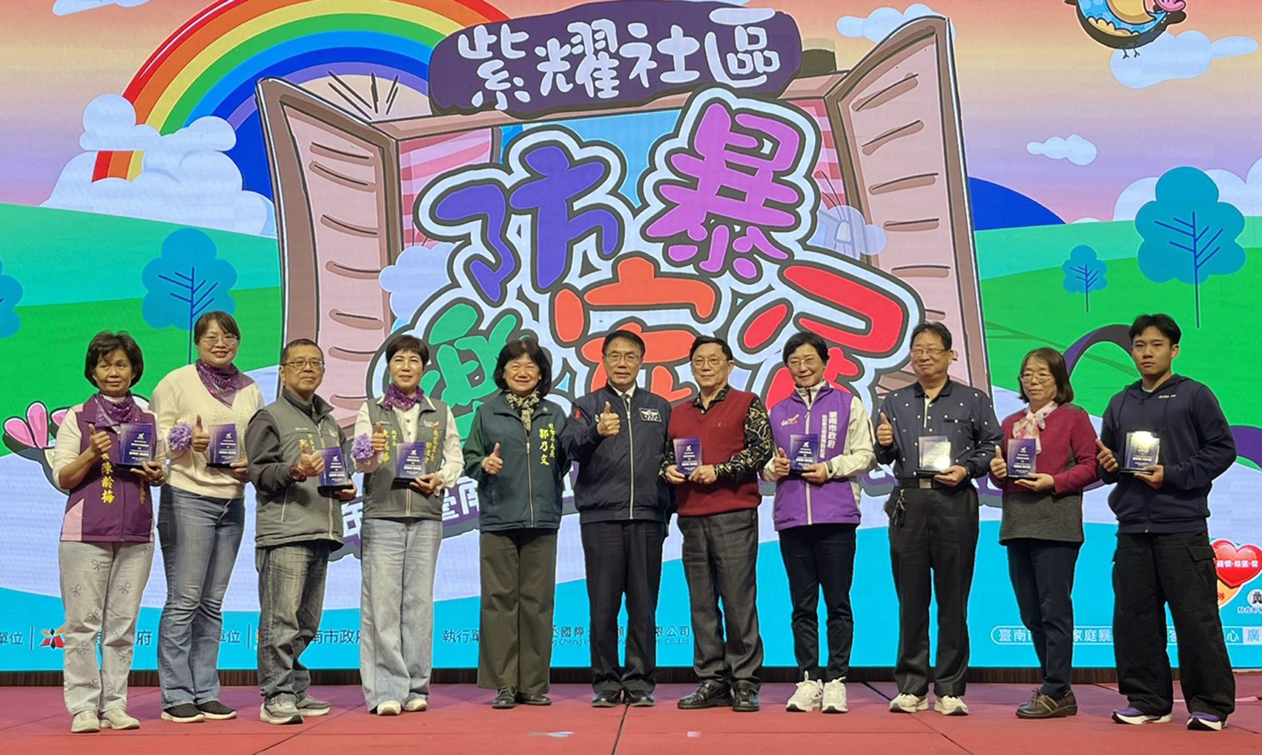 南區大恩社區發展協會理事長施國熙指出,大恩社區發展協會自一一一年起加入本市初級預防宣導社區,歷經三年的防暴量能培植與經驗積累,一一四年成為初級預防領航社區,更榮獲衛生福利部金卓越社區,也代表台南市參與紫絲帶社區初級預防一朵花認證,將防暴服務精神推廣至各社區單位,一起打造無暴力的幸福家園。