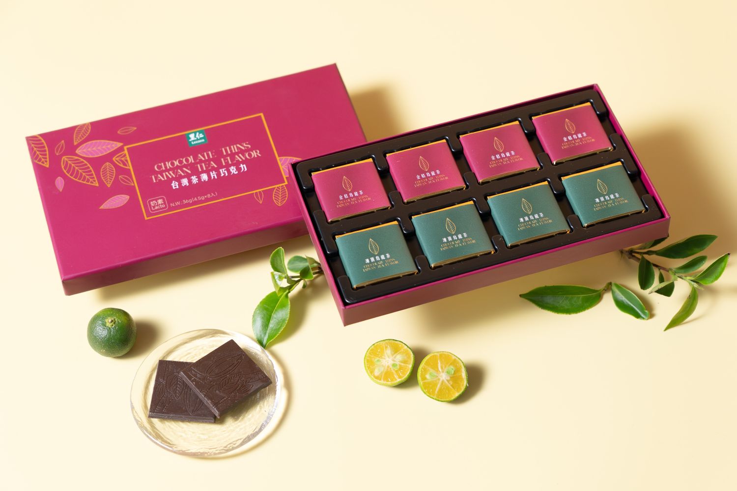里仁年貨「台灣茶薄片巧克力」在原有「凍頂烏龍茶」口味之上,加入友善耕作四季桔,新推出「金桔烏龍茶」巧克力。(里仁公司提供)