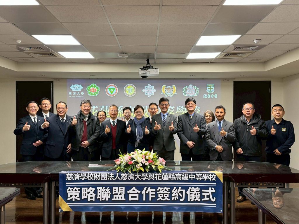 慈濟大學與花蓮七所高中職十四日簽署策略聯盟合作意向書,分別是花蓮高中、花蓮女中、花蓮高農、花蓮高工、花蓮高商、四維高中、海星中學,一起攜手扶持花蓮在地弱勢學生。