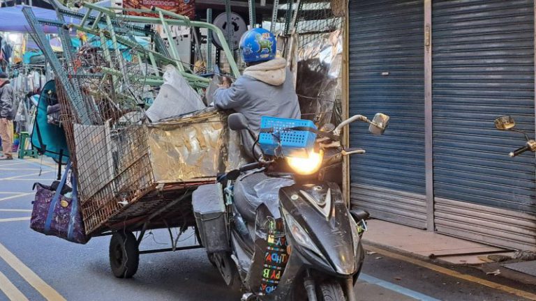 年約六十餘歲男子騎著一輛車尾中掛板車機車,車上滿載資源回收品,經過羅東一處地下道及羅東夜市,戮壞照明設備,最後卡在商店廣告看板,才勉強下車整理,被民眾稱為「移動城堡」資源回收機車。(民眾提供)