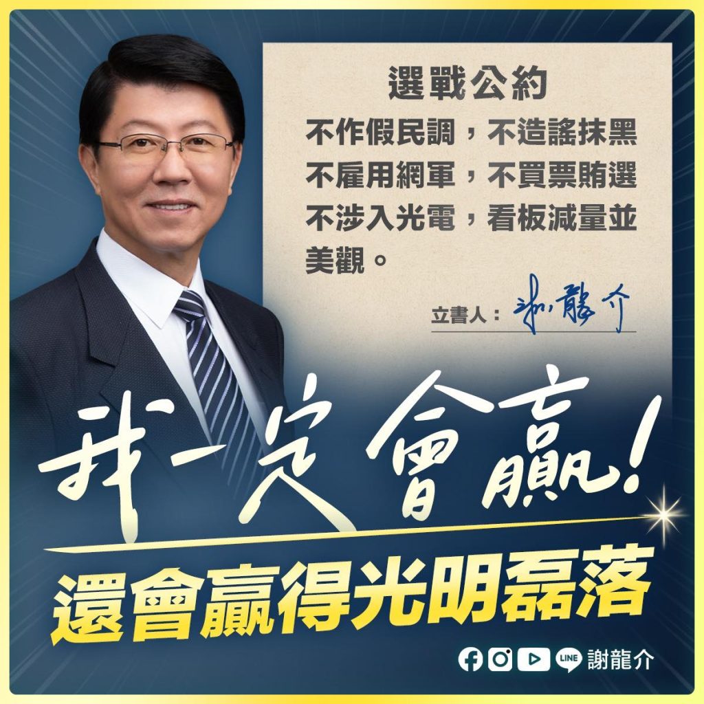 謝龍介也做出具體承諾,不作假民調、不造謠抹黑、不雇用網軍、不買票賄選、不涉入光電,看板減量並美觀。謝龍介說,這是我對台南市民,與全體國人的保證,我願白紙黑字具結,也拋磚引玉,希望亭妃能與我共同簽訂公開透明的選戰公約,讓台南市成為優質選戰的標竿,讓台南市民引以為榮。