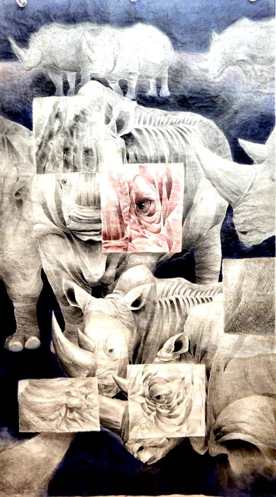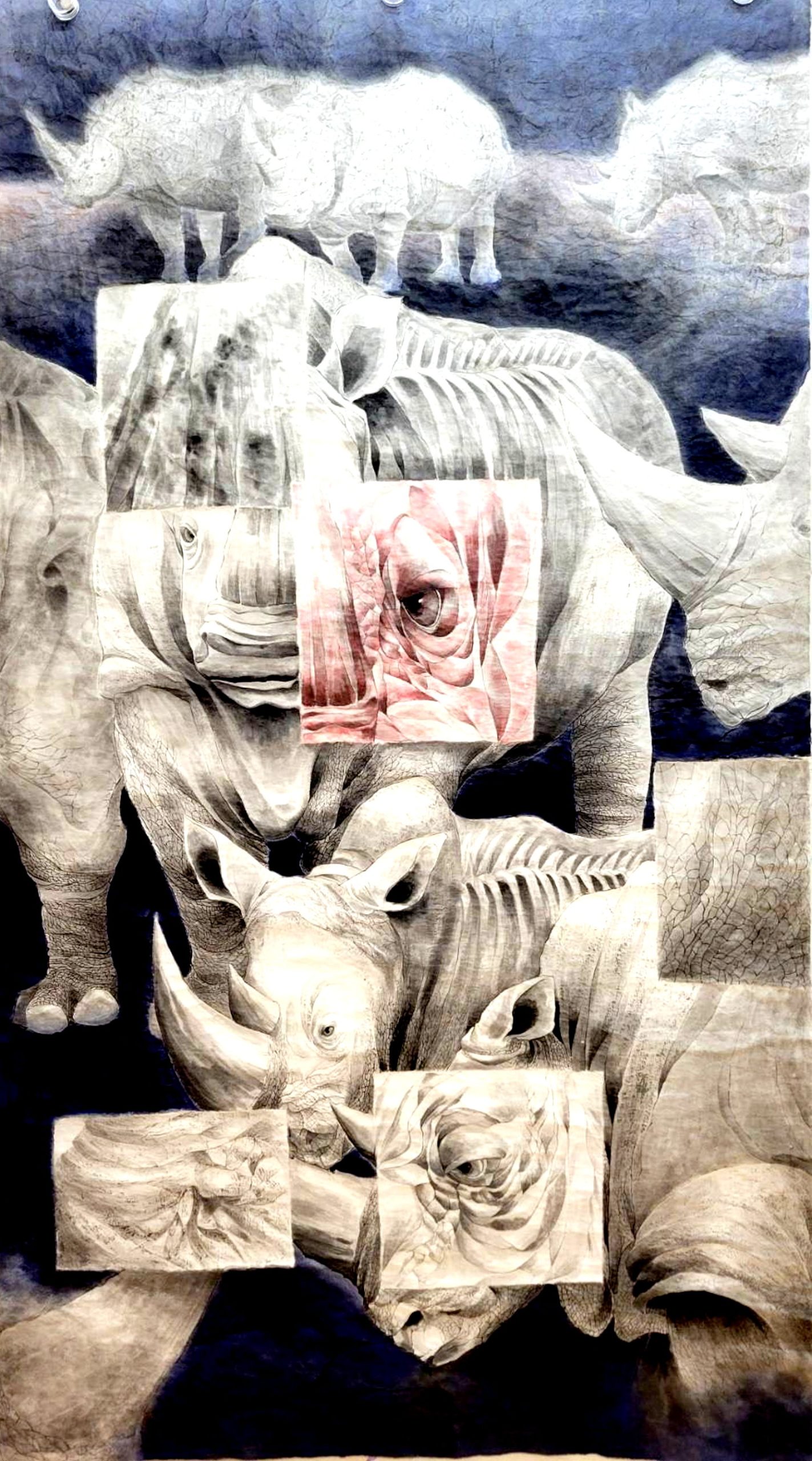 另水墨類大專組特優王偲紜的作品「被剝奪者」,創作發想來自於其觀看白犀牛的故事之後產生的感嘆。因為人類的貪婪而差點滅絕的犀牛遭到盜獵者持槍射擊,本屬於牠們身體一部分的角被硬生生割下,諸如此類的畫面令王偲紜印象深刻。於是在畫中以分割畫面特寫角和眼睛,中央的紅暗示著血腥及失去,而畫面整體用墨藍色凸顯犀牛的白,加上隱約可見的骨骼,讓牠們看起來宛如發著微光的灰白幽靈,在畫面中增添無盡的哀傷和寂寥。