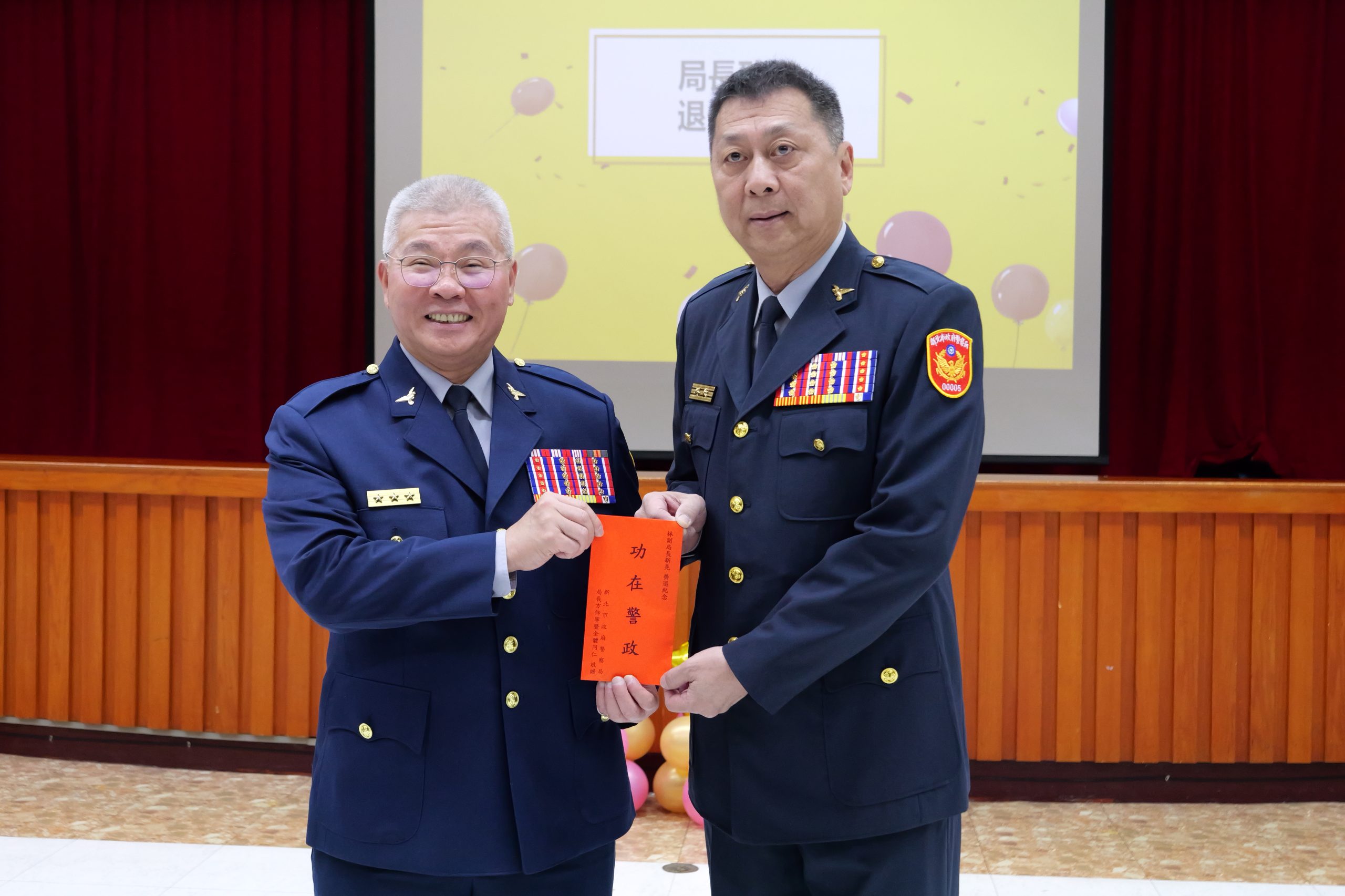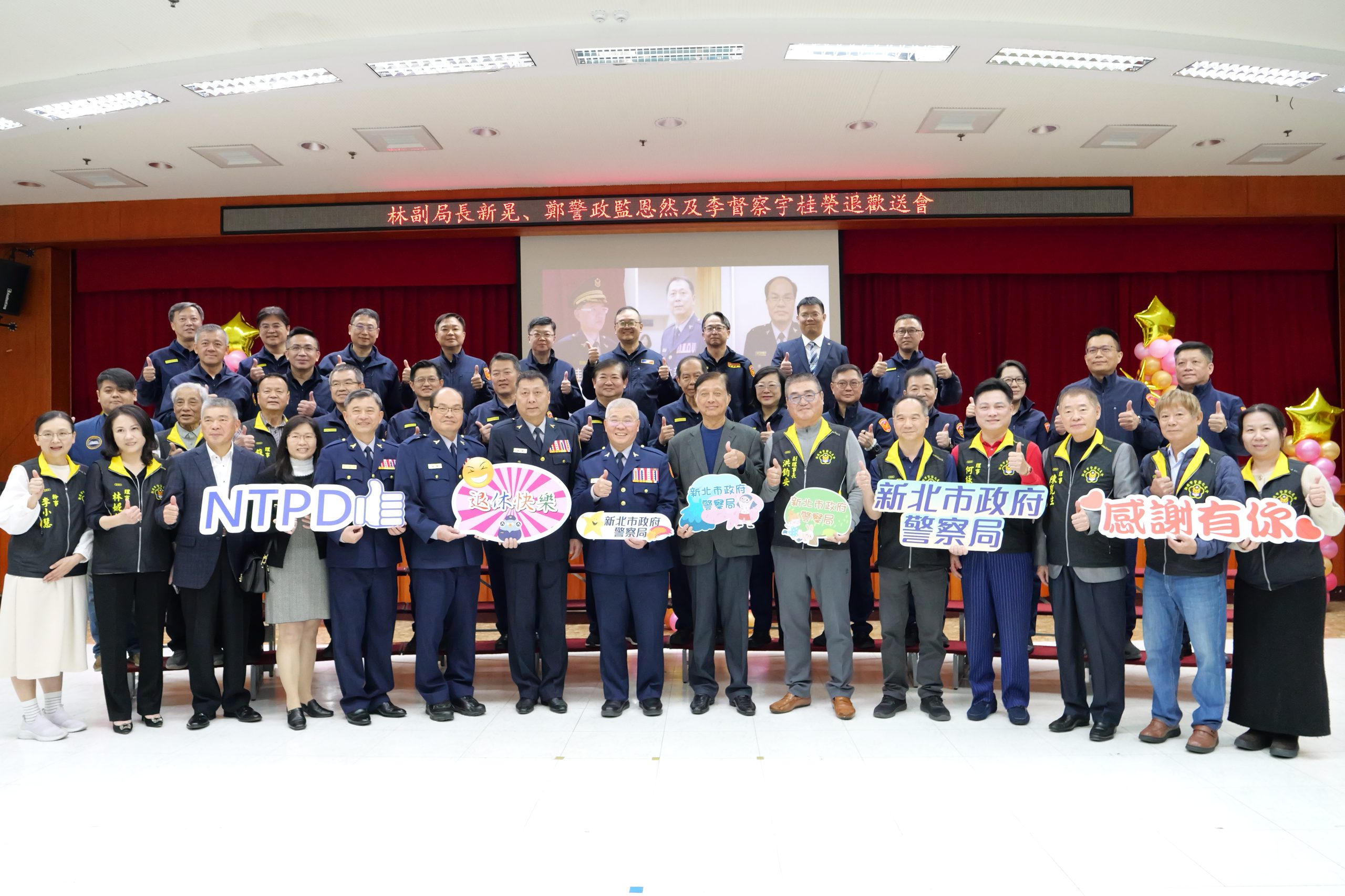 新北市警察局副局長林新晃、警政監鄭恩然及督察李宇桂將於明(16)日屆齡退休,為表彰林新晃、鄭恩然及李宇桂多年來對警界付出與貢獻,市警察局特別於今(15)日下午舉辦榮退歡送會。