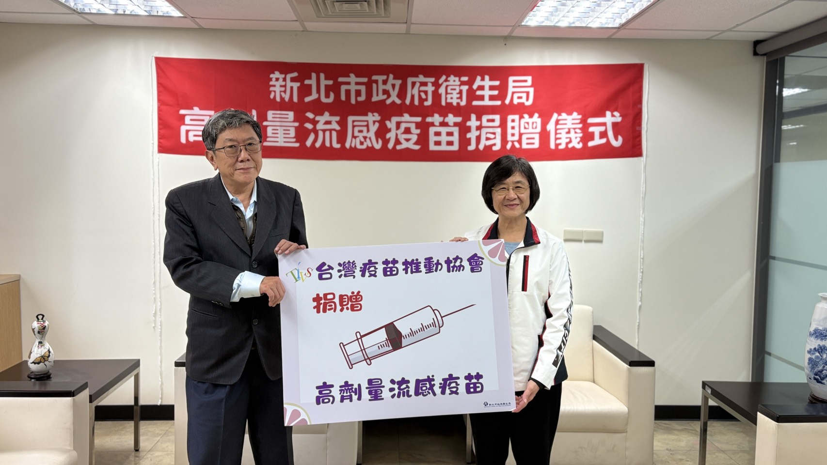 新北衛生局於今(15)日舉辦捐贈儀式,由台灣疫苗推動協會理事長李秉穎出席,衛生局長陳潤秋致贈感謝狀,感謝協會關懷高齡族群健康。李秉穎表示,高劑量流感疫苗專為65歲以上長者設計,含有標準劑量4倍抗原,可誘發較強的免疫反應,提供比一般流感疫苗更高的保護力,對免疫力較弱的長者尤為重要,國際臨床研究亦證實,高劑量流感疫苗可有效降低流感相關併發症與住院風險,安全性與一般流感疫苗相近。