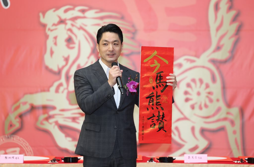 蔣萬安在出席丙午迎新春聯揮毫大會前接受媒體採訪,解釋「今馬熊讚」的寓意,希望市民每天都能充滿驚喜與精彩,並祝願大家幸福、順利與平安。