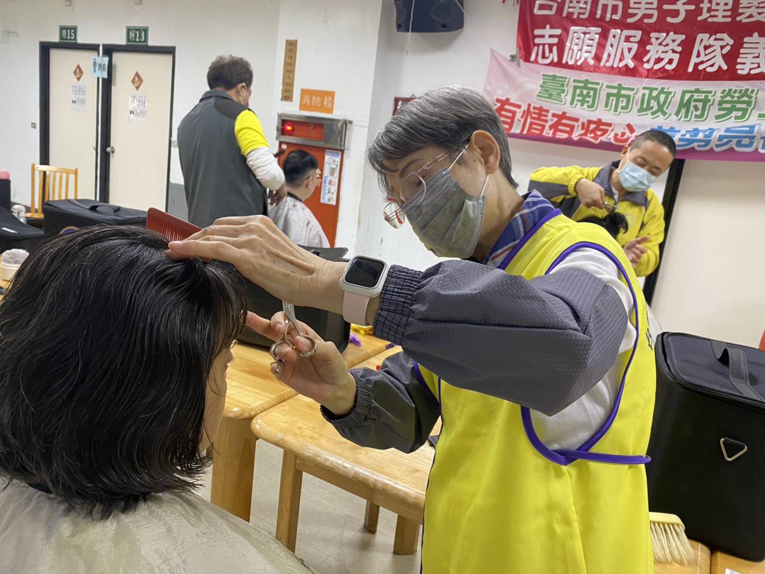 台南市男子理髮職業工會理事長陳杰雄親自帶隊,多位義剪志工攜帶剪髮器具到場替機構病友們義剪,志工以耐心和愛心和病友互動,不忘噓寒問暖,讓理髮過程相當溫馨。