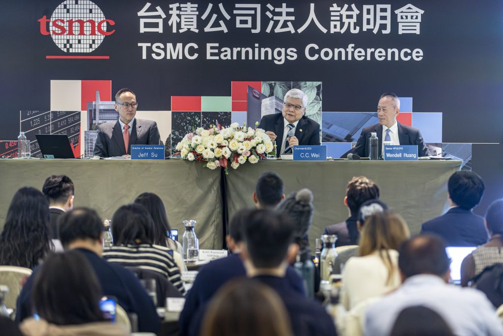 台積電十五日召開法說會,董事長魏哲家(後中)、財務長黃仁昭(後右)等人與會主持。(中央社)
