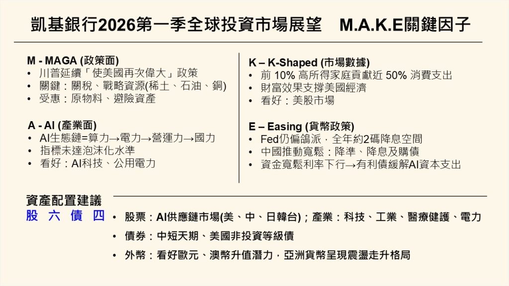 凱基銀行2026第一季全球投資市場展望 留意M.A.K.E關鍵因子布局 股六債四配置迎新春。(凱基銀行提供)