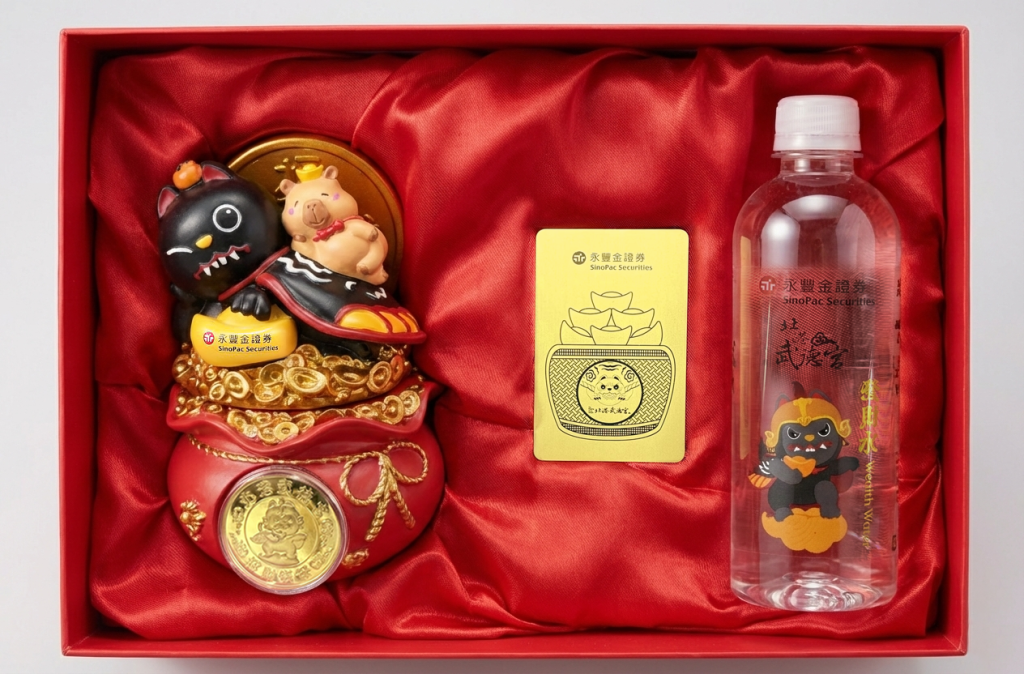 永豐金證券為祝福貴賓客戶2026財運馳騁、騰躍富貴,今(2026)年再度攜手台灣財神信仰重鎮「北港武德宮」,推出限量16,000份聯名招財年節禮盒,皆印有黑虎將軍助招財、咬財,元月20日起於各分公司回饋貴賓客戶。禮盒獨家集結三大開運法寶:鑲有武德宮錢母的「黑皮巴拉聚寶盆」、「五路亨通發財水」、國內首創將股票禮品卡化為送存股金的「招財存股開運卡」。今年透過祈福儀式,帶回武德宮滿滿財氣。