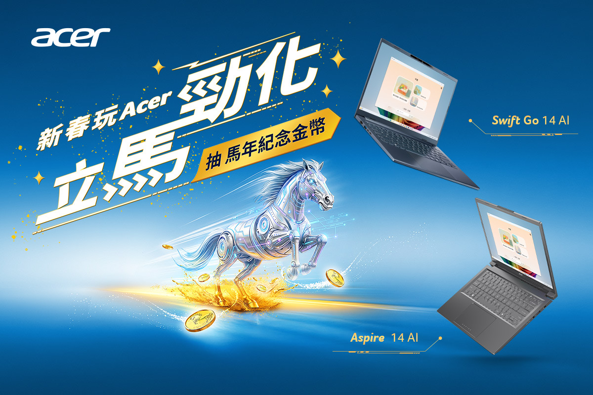 迎接新年度到來,宏碁正式展開「賀歲迎春」促銷活動。凡於活動期間購買指定 AI 筆電、電競筆電、平板及桌機,不僅能享受最新科技體驗,更有機會將市價超過萬元的馬年紀念金幣帶回家,並針對不同系列加碼贈送機械鍵盤、遊戲手把及即享券,為消費者新年換機提供最強回饋。
