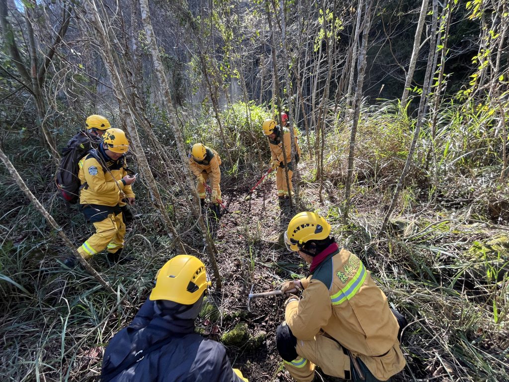 台中分署辦理高山型森林火災防救實境模擬演練,藉由觀察、分析現場地形與林相,研擬防火線開闢及撲滅林火的相關實務,透過緊急應變指揮系統的專業分組操作,以最小影響之滅火戰術的運用與探討,精進森林火災滅火技術及效率。