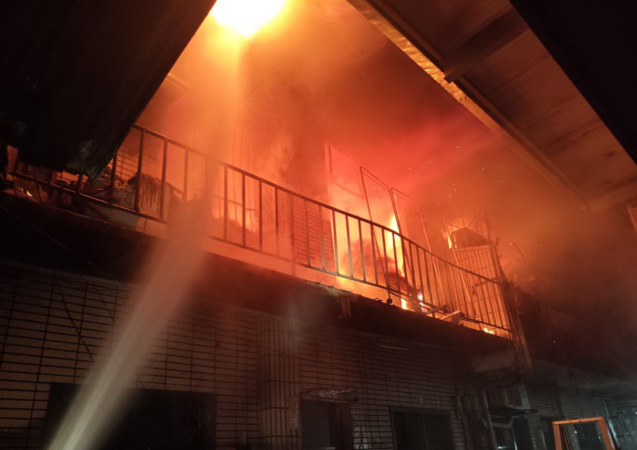 現場二樓陽台與室內全面燃燒,火舌沿著鐵欄杆竄出,熱浪不斷逼退救災人員,外牆磁磚遭高溫燻黑剝落,屋內家具與雜物成為助燃物,火勢迅速延燒至左右相連住戶,消防人員全力防止火勢擴大,歷經一個多小時奮戰,終於在昨日凌晨零時十六分將火勢撲滅。
