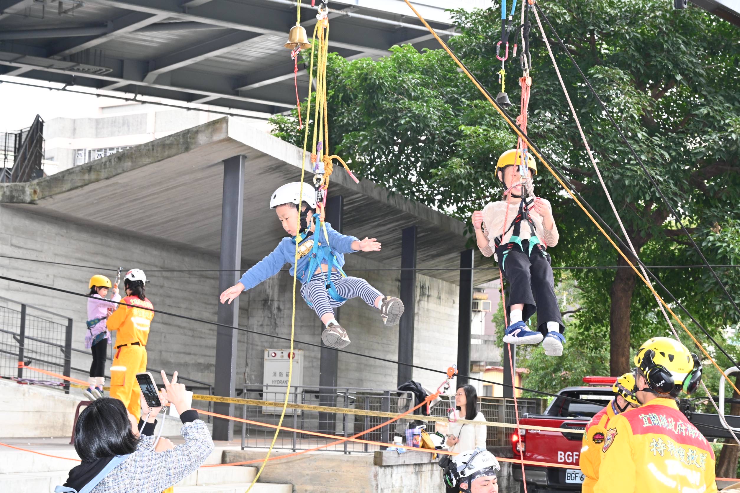 此外,現場還有提供消防繩索救援體驗、雲梯車搭乘、消防瞄子射水、小型空拍機模型供民眾操作及電腦模擬飛行體驗,參加小朋友都流連忘返,讓民眾透過闖關方式輕鬆學習重要知識。還有兩隻可愛的消防大頭公仔穿梭其中,與大小朋友互動合照,成為現場人氣焦點。