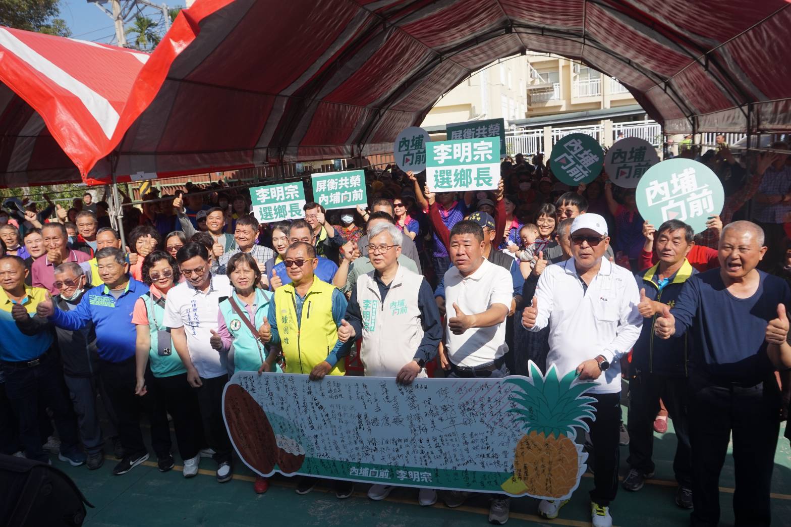李明宗參選記者會現場湧入近四百位鄉親,現任鄉長鍾慶鎮也帶領多位鄉代及村長共二十餘人力挺,聯合推薦李明宗是下屆內埔鄉長最佳人選,鍾慶鎮向現場鄉親表示李明宗熟悉行政體系、溝通能力強,具備承接內埔發展的戰力,絕對能讓內埔大發展。