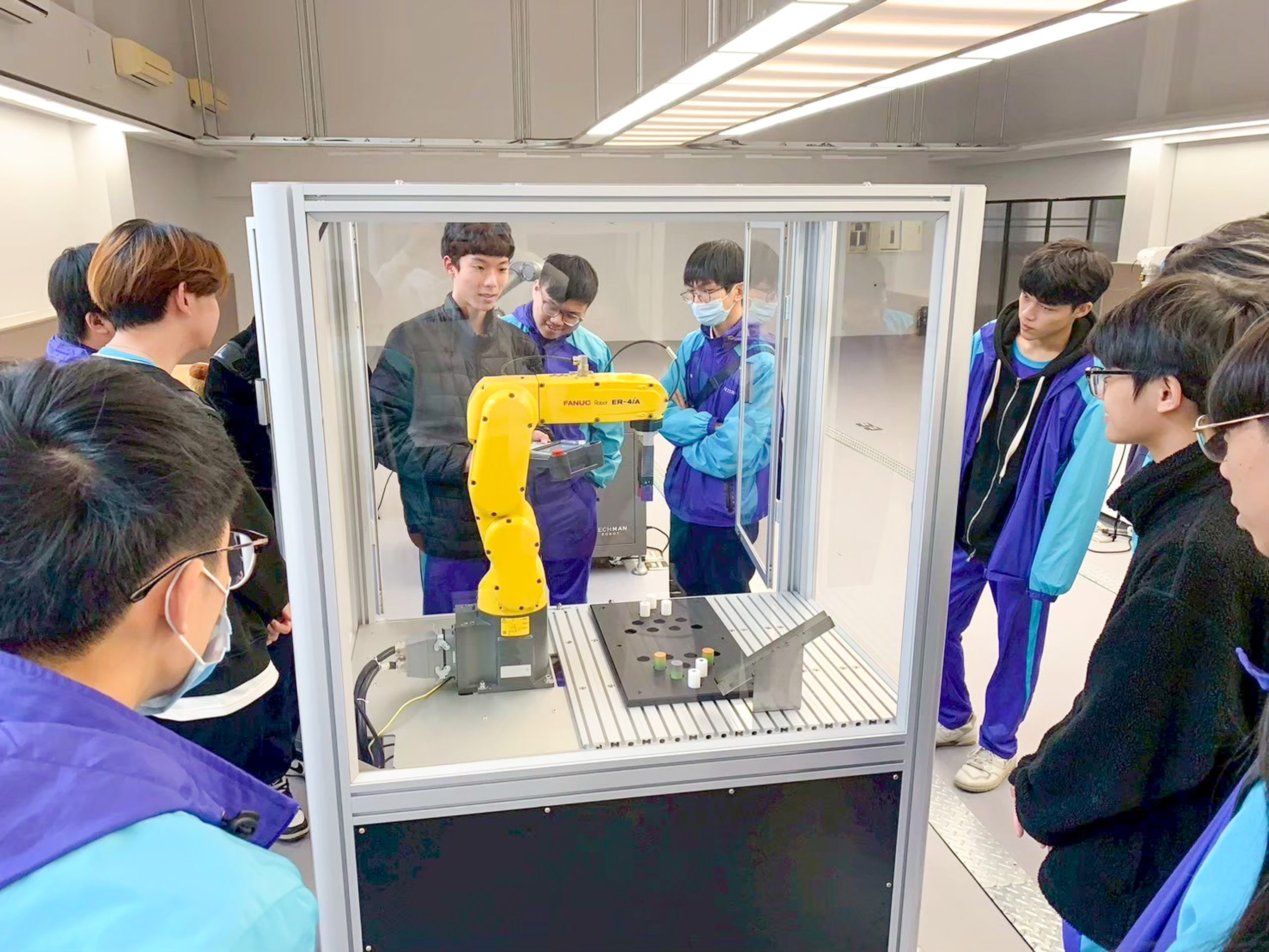 三重商工機械科學生在實習工場學習智慧型機器手臂操作(新北市教育局提供)