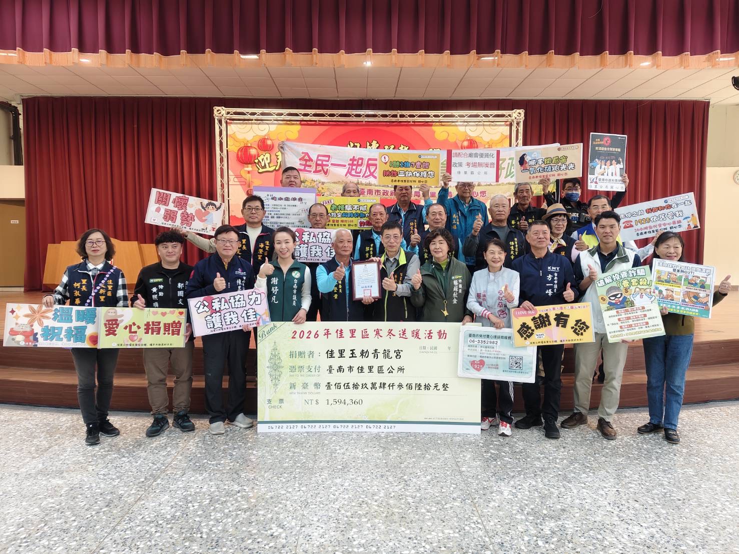 十八日的送暖活動在「雅姿舞蹈藝術中心」精彩表演中揭開序幕,優雅動人的舞姿為現場營造熱鬧溫馨的氛圍;現場物資發放,「笙韻藝術推廣協會」更以樂器演奏相伴,透過悠揚樂聲傳遞關懷,讓參與民眾在音樂中感受到滿滿的祝福。區長林耿漢表示,感謝佳里玉勅青龍宮及所有與會貴賓,共同為弱勢家庭送上二0二六年新春的祝福,更期許未來有更多的民間團體一起加入公益行列,共同守護社會弱勢家庭」。