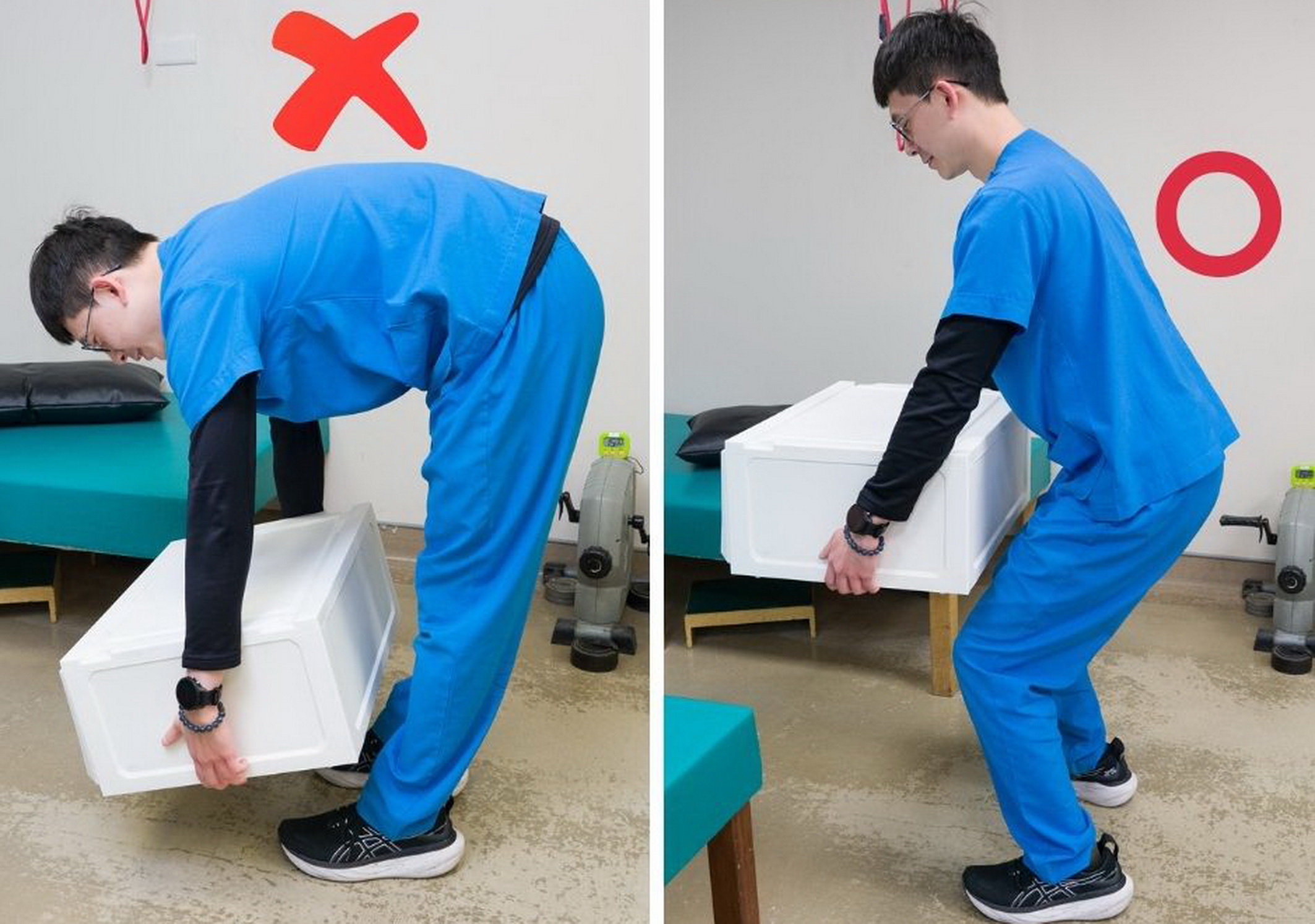 陳音翰強調,許多人受傷是因為「彎腰直膝硬提」的錯誤使力,首要原則應是「屈膝莫彎腰」,應先蹲下靠近物品,保持背部平直,利用大腿與臀部力量站起,而非直接彎腰靠脊椎硬撐。同時應將重物貼近身體重心,並在動作前縮腹啟動核心肌群,才能在日常工作中有效保護脊椎,遠離閃腰風險。