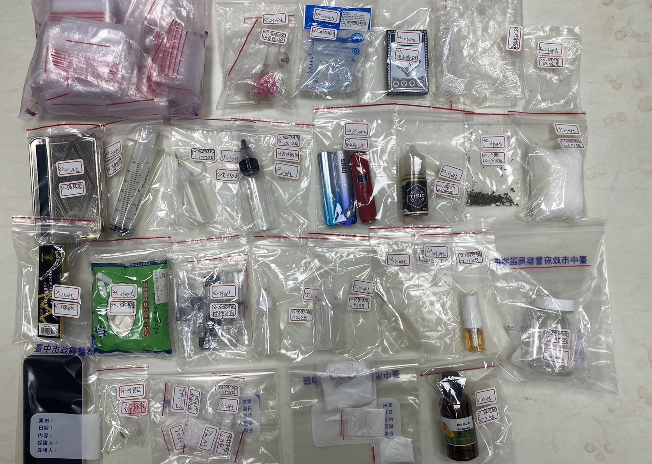 警方隨後又在房內搜出海洛因五包、安非他命五包、依托咪酯煙彈八顆、依托咪酯煙油五罐、手機、電子磅秤、吸食器及毒品製造分裝工具一批等證物,劉女遭聲押獲准。