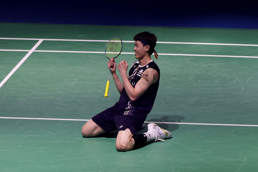 台灣「左手重砲」林俊易18日在BWF印度羽球公開賽男單決賽,以21比10、21比18擊敗世界第4的印尼好手克里斯蒂,不但是對戰2連勝,更是生涯首度在750等級賽事奪冠;奪勝後林俊易開心跪地、躍起振臂。