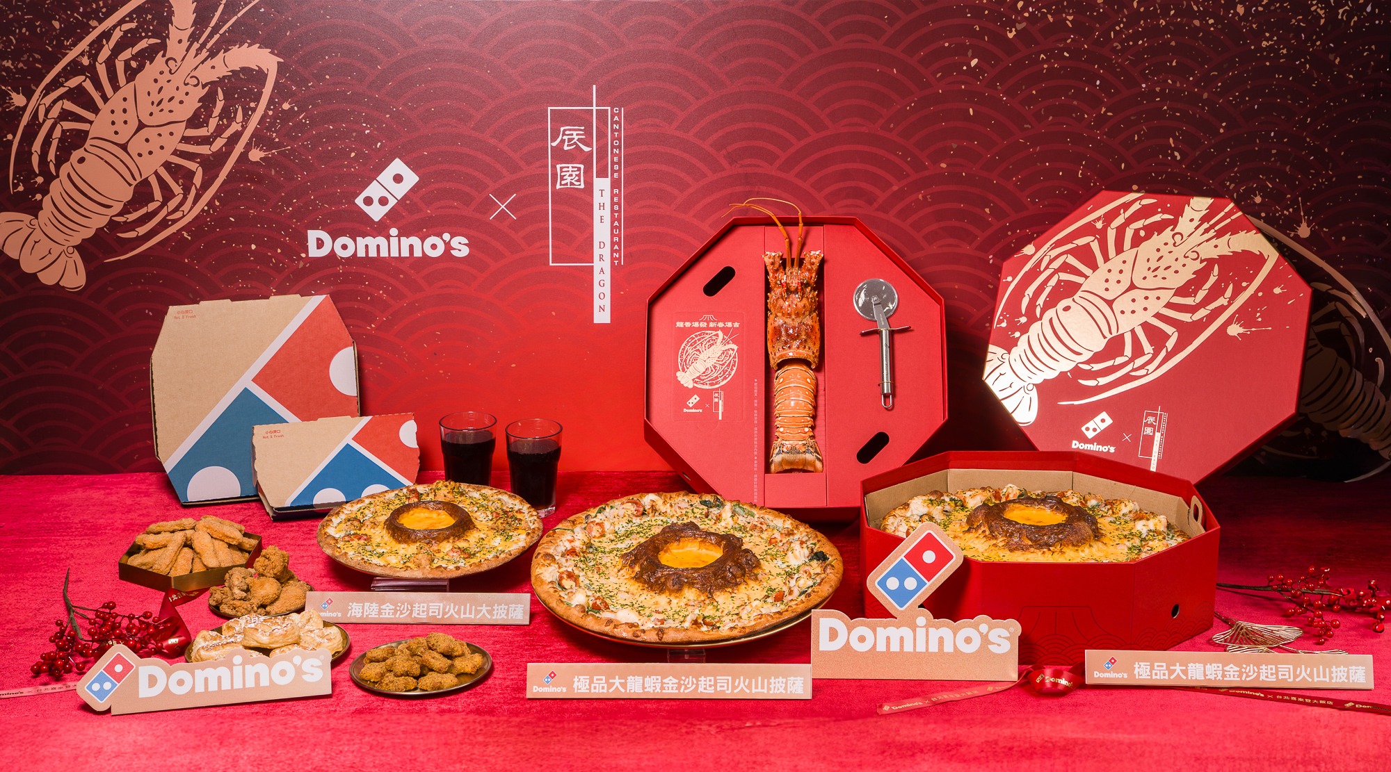 「極品大龍蝦金沙起司火山披薩」嚴選「一整隻」加勒比海野生大龍蝦,鮮甜的龍蝦增加味蕾豐富層次,搭配濃醇厚實吃得出金沙顆粒與香氣的金沙起司火山,大口鮮甜龍蝦與濃郁金沙風味在口中交織爆發!達美樂更推出「金典龍蝦盛宴盒」,以八角盒型象徵「八方來財 團圓富貴」,搭配喜氣紅為主調並點綴頂級龍蝦意象的大器設計,從視覺就能感受到富貴吉祥的美好寓意,並附贈專屬披薩刀與爆吉賀年卡,開啟整年度的爆吉好運就靠達美樂的「金典龍蝦盛宴盒」!