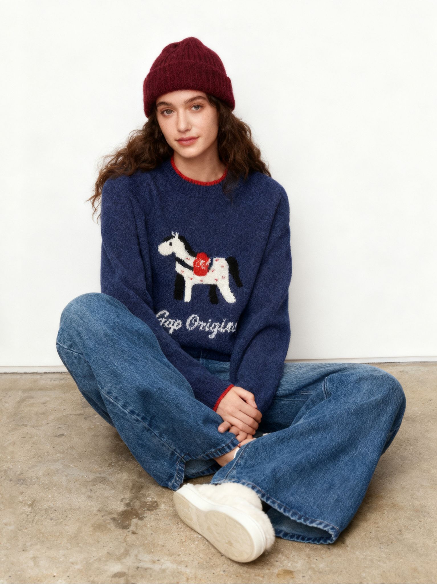 Gap巧妙融合生肖元素,打破過年服飾俗氣的刻板印象,將美式復古風格與東方吉祥寓意完美結合。焦點單品「圓領刷毛上衣」,胸前以仿舊印刷技法展現美式復古韻味,搭配駿馬剪影圖騰,以奮力前躍的姿態展現奔騰活力,象徵跨越限制,成功得分;經典Logo連帽上衣則以QR「碼」諧音作為創意發想,透過幾何像素構築出暗藏金元寶圖騰的Gap Logo迷宮,象徵馬年連破重重關卡,終將收穫豐富財寶。女裝針織上衣與童裝刷毛連帽上衣上皆有馬兒揹著錢袋的圖案,直白表述「馬上發財」的好運寓意;Gap招牌「布萊納小熊」也提著紅燈籠驚喜現身童裝上衣,張燈結綵同賀新年。Gap馬年系列的多元設計,讓全家大小在團圓時刻,輕鬆穿出最時髦的親子開運造型。