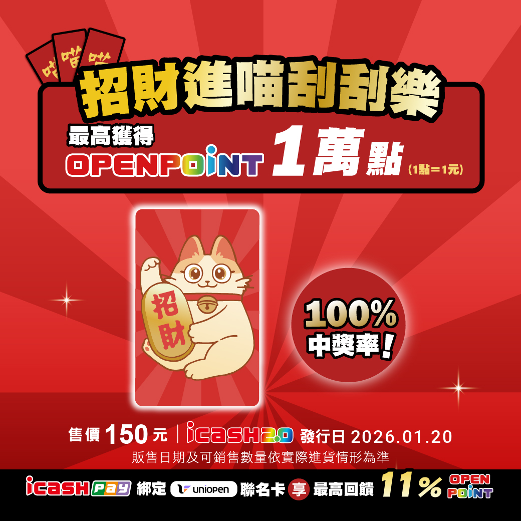 春節就是要紅包、要加碼、要中獎!「2026 招財進喵刮刮樂 icash2.0」以喜氣滿滿的招財貓為主角,可愛的貓咪搭配滿滿金幣元素,象徵新的一年財氣進門、好運不斷,讓每一次的支付,都像在幫你招財聚集財運,這次更特別將刮刮樂遊戲設計於卡片背面,每張卡片都能隨機刮出OPENPOINT點數,最高可獲得10,000點OPENPOINT(等值10,000元),100%的中獎率,讓人人都有獎,真正做到「隨刮隨中、包包有獎」,隨買隨刮的樂趣,讓icash2.0不只是方便支付的工具,更是一張帶來好運的強運神卡,無論自己購買、或是春節送禮、發紅包,甚至於公司行號團購,討喜又實用的趣味,讓每個人都能開心過好年!
