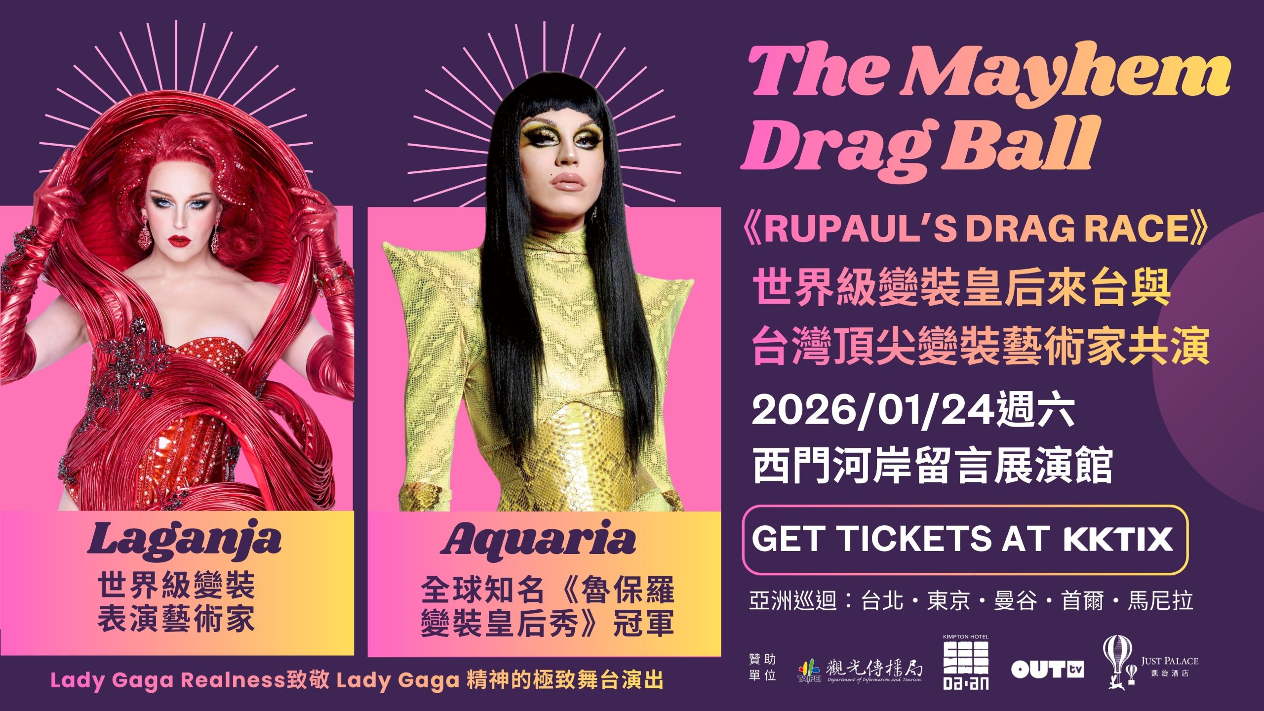 今年壓軸的國際變裝藝術秀,匯聚了RuPaul’s Drag Race知名選手真的不容錯過。RuPaul’s Drag Race自2009年開播至今,已發展成全球最具影響力的變裝與流行文化節目之一。Aquaria身為第十季冠軍,是當代最具時尚影響力的變裝藝術家之一,以高概念視覺、前衛時尚與強烈舞台風格聞名全球,被視為與 Lady Gaga美學高度呼應的Drag表演人物,IG帳號@ageofaquaria擁有超過150萬追蹤者。Laganja Estranja則擅長融合音樂編舞與高能唇同步奏,為全球Drag舞台最具辨識度的表演型藝術家之一,總能點燃全場熱情,IG @laganjaestranja也擁有近70萬追蹤者。整個節目19:00暖場開跑,20:00至22:00進入Lady Gaga主題變裝演出,另有超過10位頂級台灣變裝藝術家共襄盛舉。