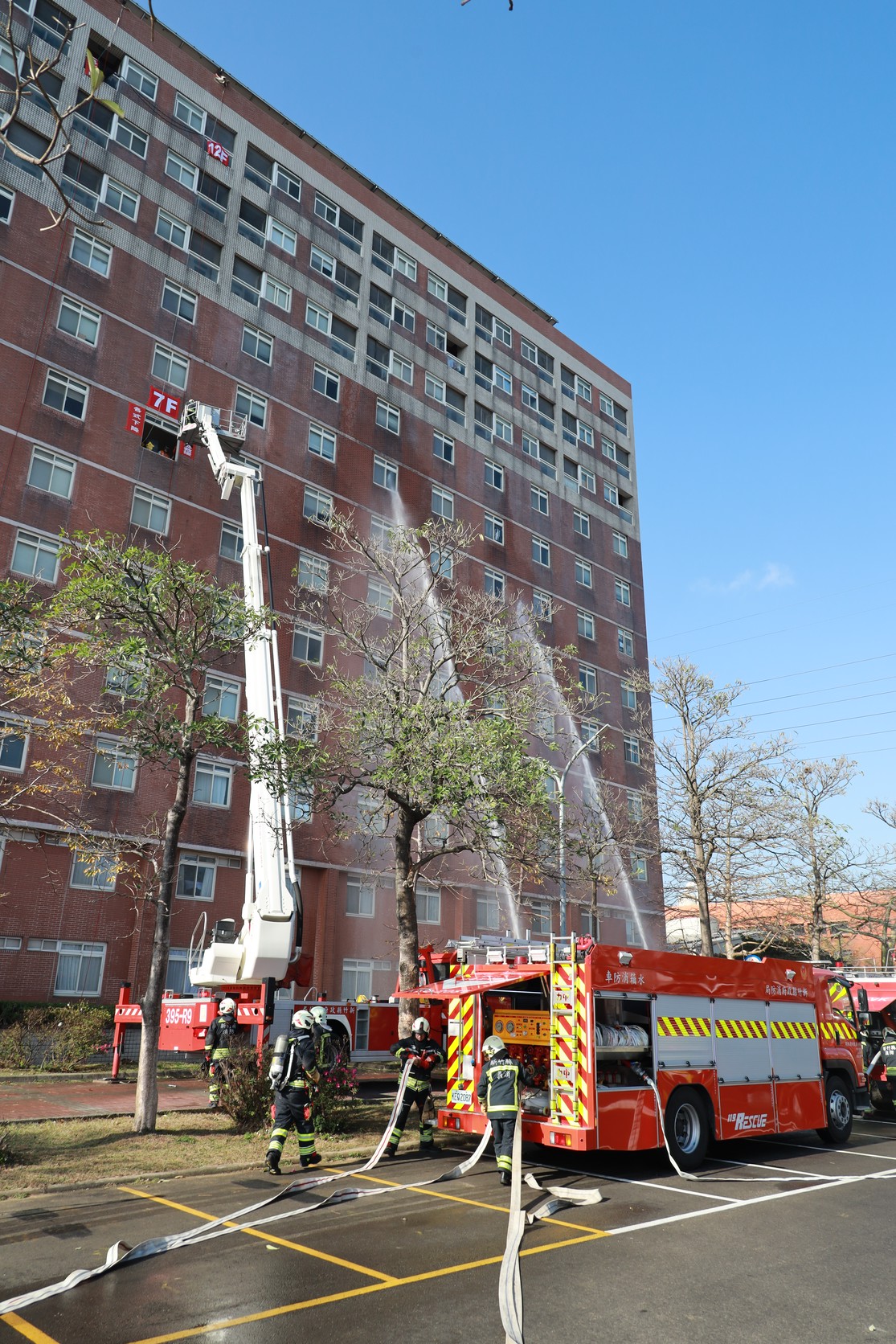 演練情境中,規劃多位民眾受困,以展現消防人員在面對多名受困民眾受傷的狀況下,如何快速進行傷患搶救、緊急處置及安排後送急救醫院事宜,演練過程中包括鐵捲門破壞、美式梯人命救助、雲梯車高樓救援、直線雲梯車緊急脫困、大隊指揮中心成立、電動車救援、救災機器人射水防護及無人機空勘回傳災情等各項搶救戰術運用,實兵演練過程萬分逼真。