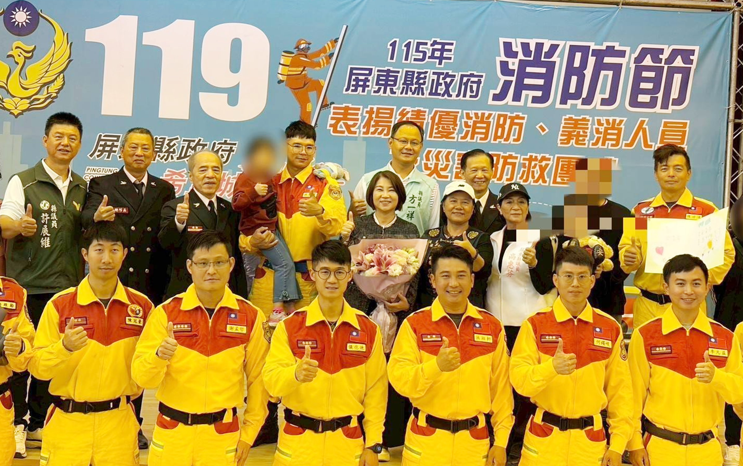 屏東縣政府十九日舉行消防節表揚大會,去年花蓮縣馬太鞍溪堰塞湖潰堤,屏東特搜大隊成功救出受困超過一天的六歲小女孩,也現身感謝救難人員的辛勞,場面溫馨感人。