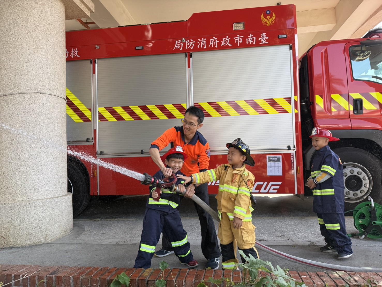 現場提供實際噴水操作,在消防隊員陪同下,兒童穿著消防衣扮演小小消防員操作消防瞄子射水,讓防災觀念從小扎根。法源幼兒園師生準備感謝卡,向消防人員表達感謝之意。