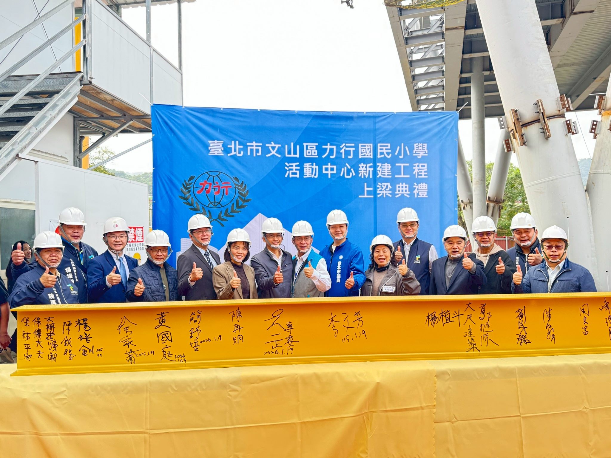 台北市文山區力行國民小學活動中心新建工程於十九日舉行上梁典禮,主典由台北市工務局李文芳總工程司主持,台北市教育局黃一正專門委員及各界貴賓見證此階段性里程碑。