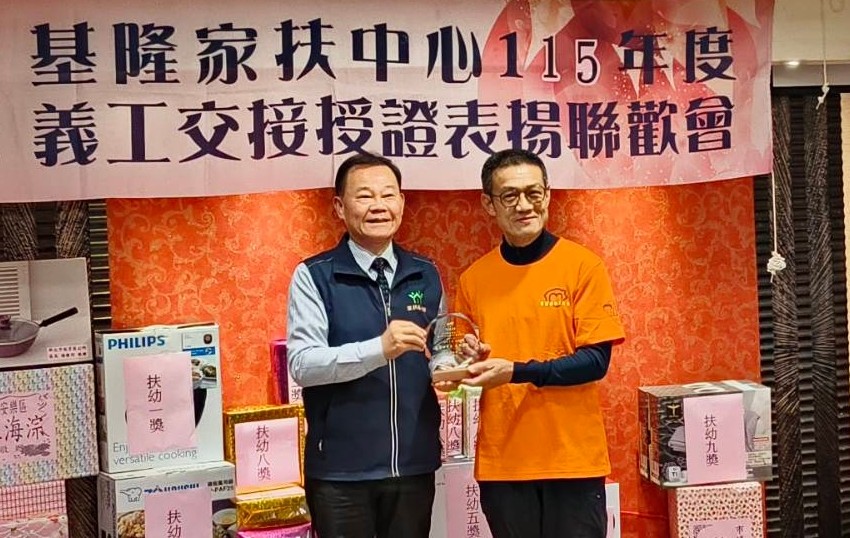 基隆家扶中心十八日於柯達大飯店舉行年度志工交接授證表揚暨聯歡會,立委林沛祥、議長童子瑋、議員鄭愷玲、秦鉦、郭美秀、呂美玲、吳驊珈、俞叄發,以及扶幼主委簡世南、前主委林榮吉、陳生南、張恩浩、游經勇、甘清良、吳世偉、萬年顧問團長郭曉玲、顧問莊榮欽、胡朝進等出席致意。