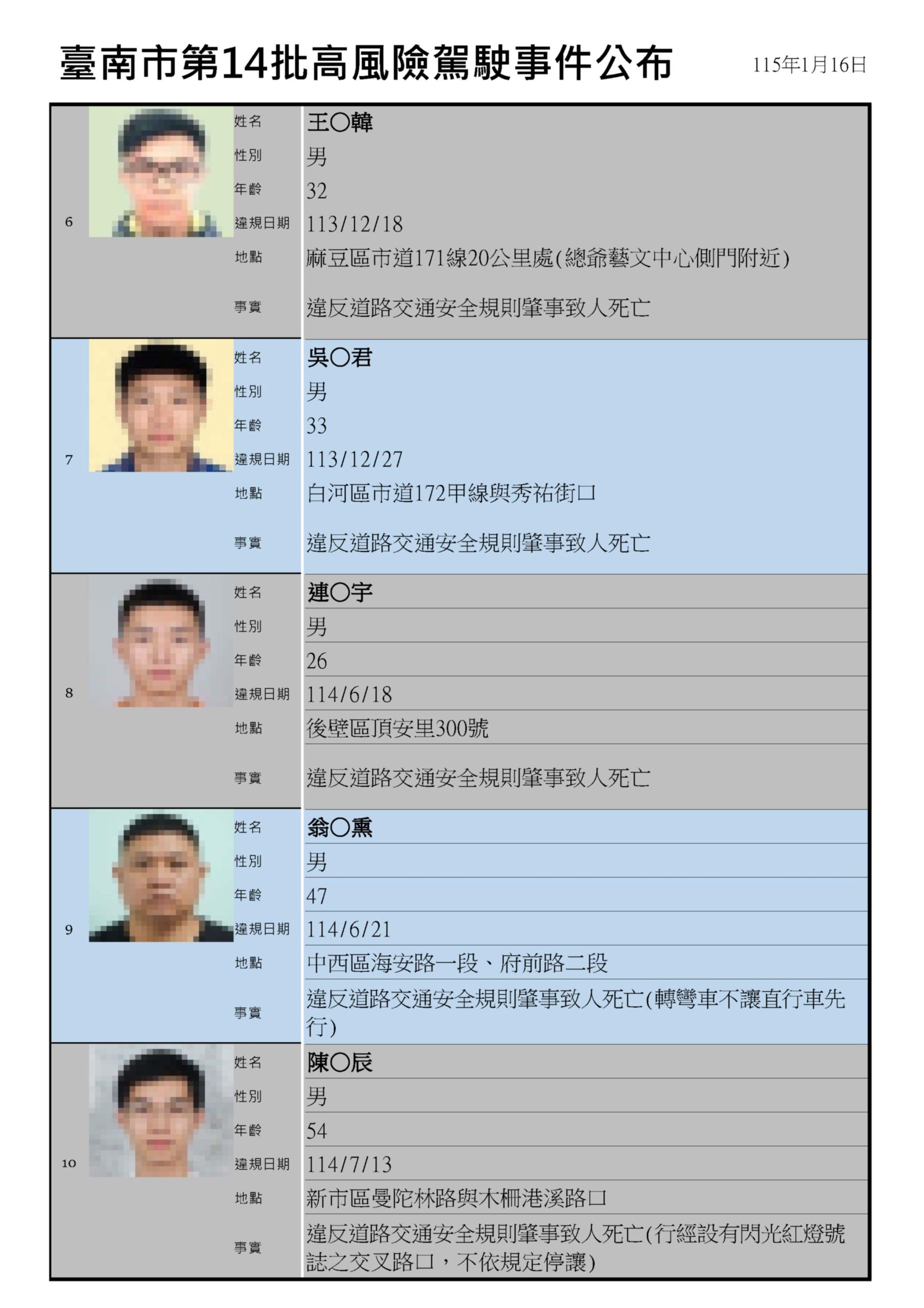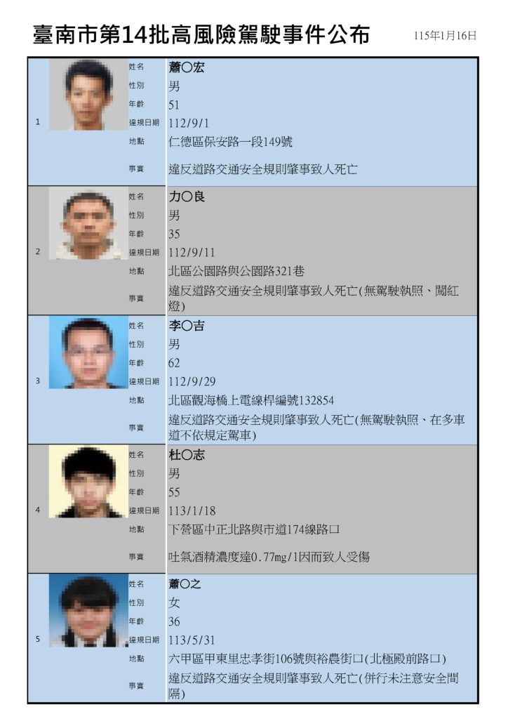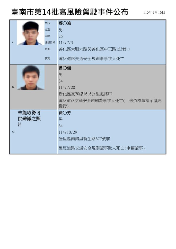 交通局此次公布第十四批高風險駕駛事件,共十三案,違規地點分別在北區、仁德、下營、六甲、麻豆、白河、後壁、中西區、新市、善化、新化及佳里區等,其中,兩名無照駕駛違規地點都在北區,事件皆發生在前年九月,分別為三十五歲力姓男子及六十二歲李姓男子,力男不僅無照駕駛,甚至闖紅燈 因而釀禍,而李姓男子則在多車道違規駕駛。