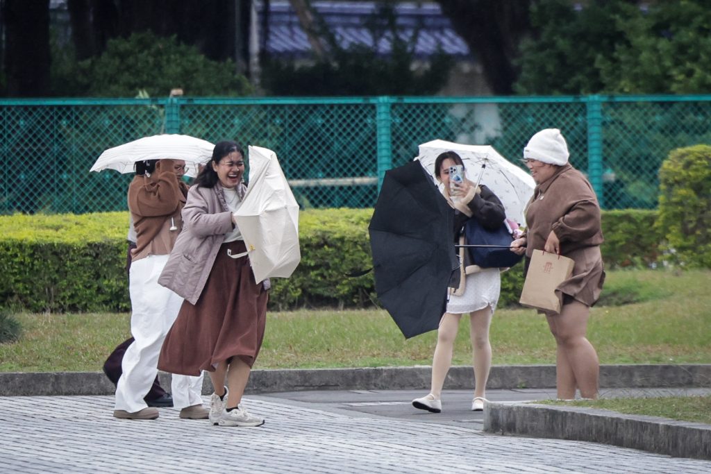 台北市19日飄細雨,遊客在中正紀念堂撐傘遭陣風吹翻,仍不減興致拍照留念。(中央社)