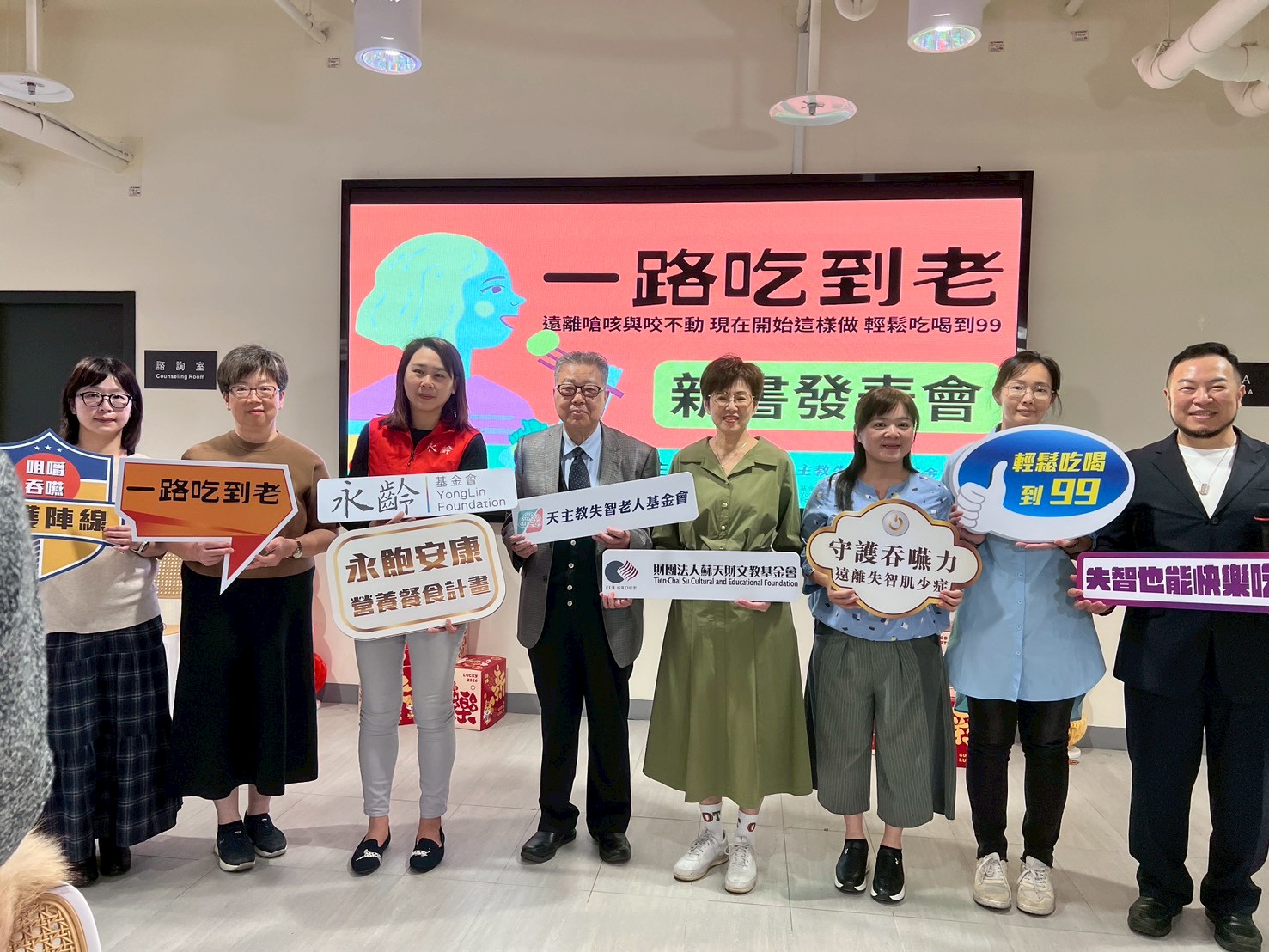天主教失智老人基金會累積28年在第一線照護失智者的服務經驗,看見失智者隨著病程進展,吞嚥能力逐步退化,對生活品質與照顧負荷造成極大影響,故在蘇天財文教基金會與永齡慈善基金會的捐助支持下,邀請到國內8位牙科、復健、神經內科、吞嚥、藥學、營養等領域頂尖的專家學者,推出「一路吃到老」書籍,書中整理出從牙口健康維護到吞嚥困難失智者之照護,呼籲國人對於吞嚥能力之維持需要及早重視。