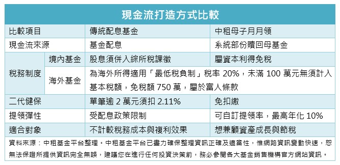 傳統配息基金雖然曾是國人創造現金流的最愛,但在當前稅務環境下,配息須全額計入個人綜合所得稅,單筆股利若超過新台幣2萬元,還須負擔2.11%的二代健保補充保費,導致實領金額大打折扣。中租基金平台總經理蘇皓毅觀察,近年投資人對稅務成本更加敏感,開始轉向兼具提領與節稅優勢的「中租母子月月領」自製現金流機制。